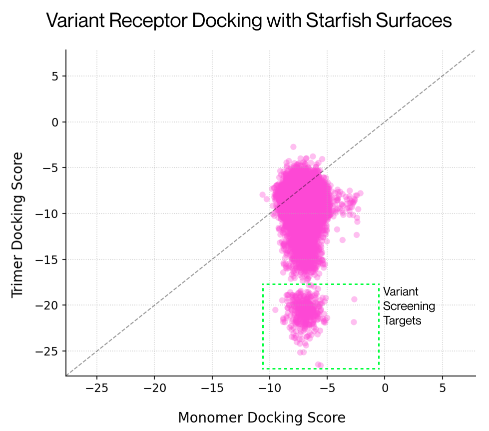 We first showcased an application of this technology at ESGCT 2025 in Seville, demonstrating that screening of the LY6A receptor was possible by performing docking to variant capsid surfaces constructed using Starfish™. We found a structural approach identified an alternative subset of hits compared to a language model-based approach, with the two methods being additive. We've been using this same approach for other receptors to investigate experimental targets predicted to exhibit differential binding. Multimer surfaces are essential to perform these larger screens, with no detectable signal present with the monomer only. For these applications Starfish™ is a crucial part of our pipeline, enabling rapid surface generation with minimal compute overheads.