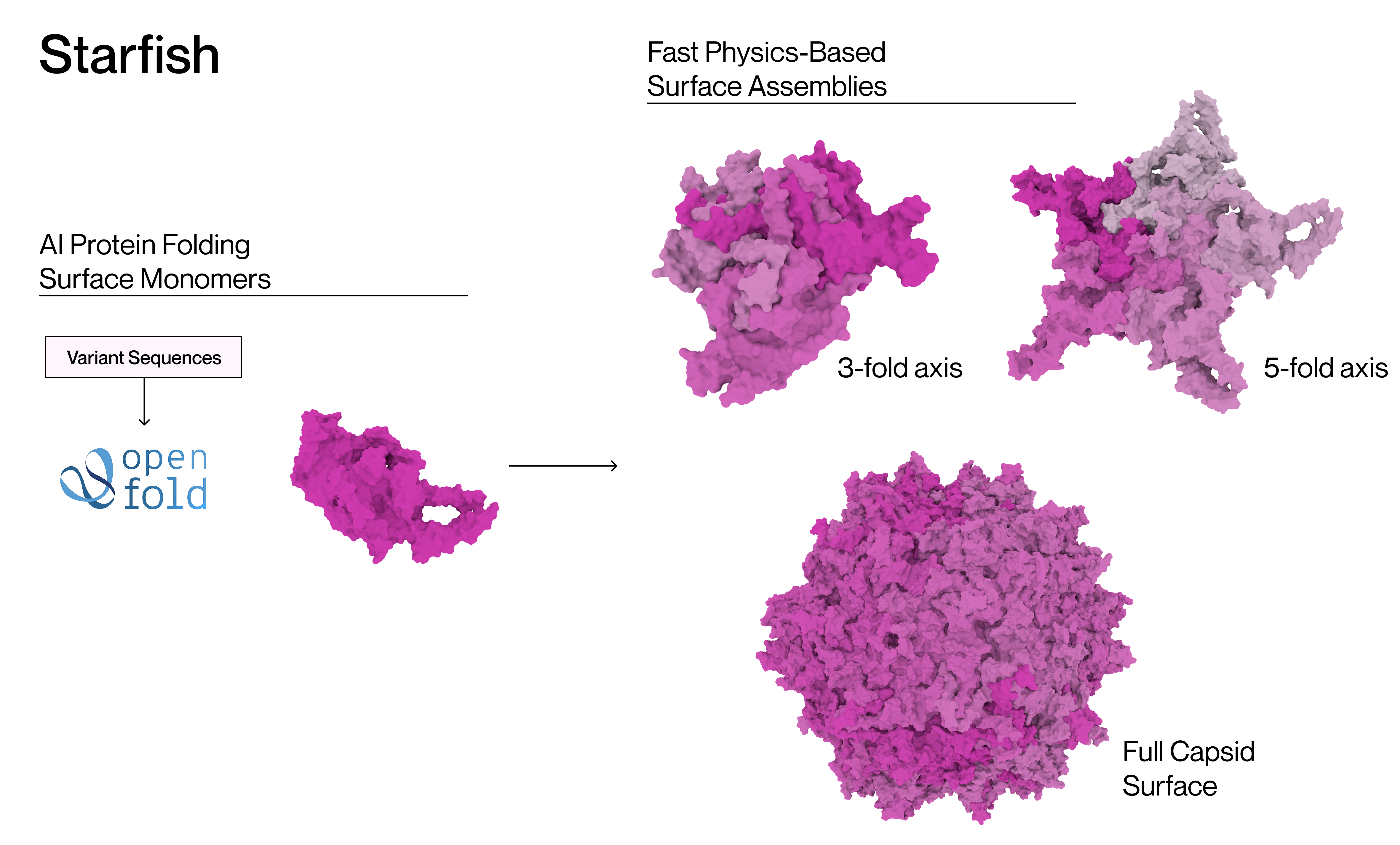 Starfish™ is an AI and physics-based structure generation pipeline enabling fast, accurate and physically plausible capsid structure generation capable of large library screening tasks. Capsids are large, complex multimers which are poorly supported by the current generation of protein folding algorithms. Starfish™ rapidly identifies relevant binding surfaces for capsid multimers using cost-efficient hardware, enabling Lir to incorporate essential capsid structural analysis into large-scale viral variant library screenings.